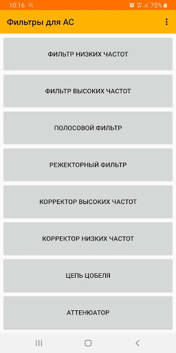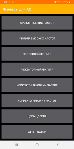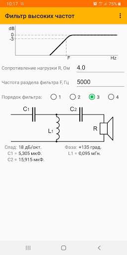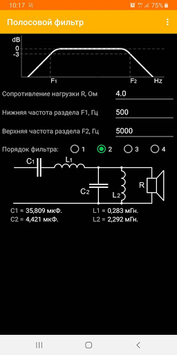 Кроссоверы для колонок представляют собой пассивные LC-фильтры звуковых частот. Приложение предназначено для расчета таких фильтров: фильтра низких частот, фильтра высоких частот, полосового фильтра, режекторного фильтра, а также корректоров амплитудно-частотной характеристики акустической системы. Предусмотрен расчет фильтров от первого до четвертого порядков.