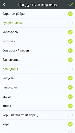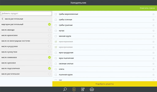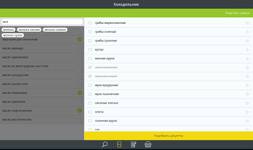 1) Укажите продукты, которые есть у вас дома и которые вы хотели бы использовать для приготовления. При желании отметьте приоритетный для поиска продукт. Приложение подберет вам все возможные варианты блюд, которые Вы сможете из них приготовить.