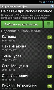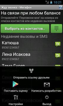 Используйте приложение "Жду звонка" и оставайтесь на связи при любом балансе! Просто выберите контакт из телефонной книги, и он тут же получит бесплатную sms "Перезвони Мне"! Бесплатно и без рекламы!