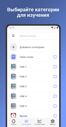 • Встроенный китайский словарь представляет собой тысячи китайских слов из HSK, разбитых по уровням, а также другие тематические наборы.