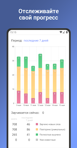 • Статистика обучения: отслеживайте запоминание слов за последнюю неделю, месяц, три месяца и год.