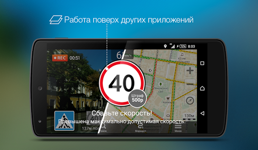 Roadly может работать в фоне как авторегистратор и при этом выдавать предупреждения поверх любых навигационных приложений, например: Waze, Навител Навигатор ( Navitel ), Яндекс.Навигатор, Sygic, iGO и др.