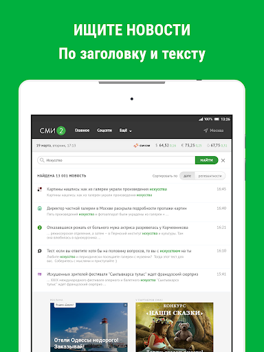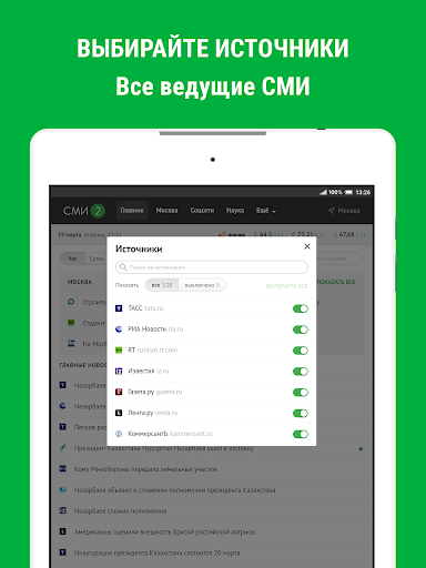 - Возможность подключения любого из 83 источников, создания своего списка любимых изданий, а также просмотра ленты за последний час или картины дня.