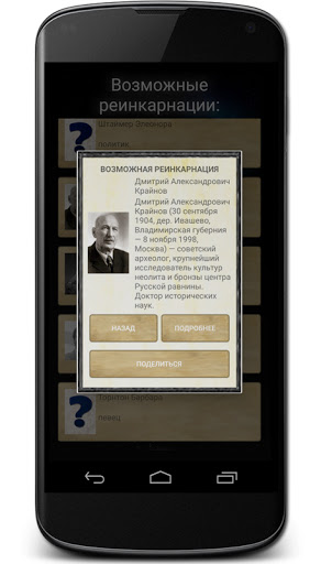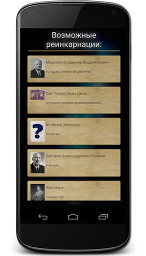 Узнайте о возможном предшественнике Вашей души. Приложение выдаст Вам список вариантов, расчитанных по специальному алгоритму. Про каждого человека в этом списке с помощью этой программы можно узнать кое-какую информацию. Возможно, с кем-то из них Вы найдёте много общего, и это и будет Ваша родственная душа (а, может, вообще одна душа - кто знает).