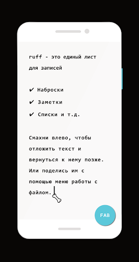 ruff — ваш верный друг, который сделает быстрые записи простым и весёлым делом. Это единый лист текста, который автоматически сохраняет прогресс между запусками — никакой мороки с кучей файлов! Вы можете отложить (спрятать в тайник) запись одним взмахом влево, чтобы вернуться к ней потом. Либо передайте её дальше (поделитесь с кем-то) с помощью меню работы с файлом.