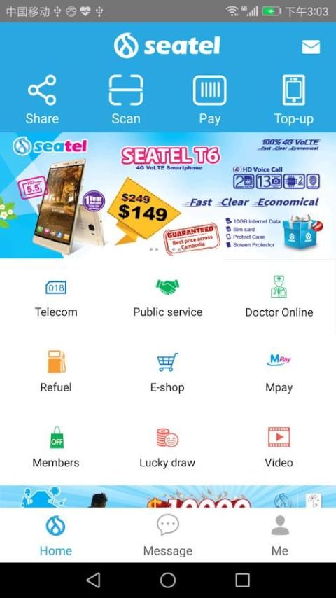 Seashop គឺជាAPPទូរសព្ទដៃដែលមាន “សុវត្ថិភាព មានប្រសិទ្ឋភាព និងងាយស្រួលប្រើ” បង្កើតឡើងដោយក្រុមហ៊ុនSeatel។ ក្រៅពីផ្តល់សេវាបញ្ចូលទឹកប្រាក់ ការត្រួតពិនិត្យវិក័យបត្រ ការគ្រប់គ្រងទិន្នន័យក៏ដូចជាសេវាកម្មជំនួយដល់អតិថិជនផ្ទាល់ ថែមទំាងមានផ្សារអេឡិចត្រួនិច ទូទាត់ទឹកប្រាក់ដែលមានទំហំតូច ការបញ្ចុះតំលៃសម្រាប់សមាជិក រង្វាន់លើការកម្សាន្ត មុខងារពិសេសផ្សេងទៀត ព្រមទាំងសេវាកម្មHot Lineសម្រាប់បម្រើអតថិជនផងដែរ។ ឆ្នំា២០១៦ ចាប់ផ្តើមជម្រុញសេវាទូទាត់ “Mpay” ក្នុងការទូទាត់ថ្លៃអាហារ សណ្ឋាគារ ថ្លៃព្យាបាល ឆ្នោតផ្សងសំណាង ព្រមទាំងសហប្រតិបត្តិការជាមួយវិស័យផេ្សងទៀត លើការបញ្ចុះតម្លៃការចាក់ប្រេងឥន្ធនៈ ពិគ្រោះជម្ងឺអនឡាញ ឆ្នោតអនឡាញក៏ដូចជាអាជីវកម្មផ្សេងទៀតលើអ៊ីនធឺណិត។ QR codeទូរសព្ទងាយស្រួលធ្វើការទូទាត់ ធ្វើអោយអ្នកទទួលបានភាពរីករាយយ៉ាងពេញលេញ “គ្រប់ពេលវេលា គ្រប់ទីកន្លែង ដោយសេរី” ជាមួយបទពិសោធន៏នេះ។