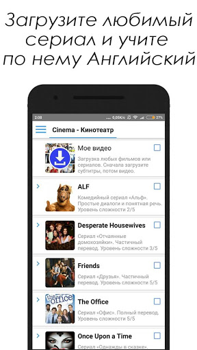 3) Кинотеатр. Добавляйте свои видео, фильмы, песни или сериалы для аудирования (аудио обучение) или смотрите и слушайте наши фильмы. Добавьте субтитры (subtitles) к видео и учите английский язык офлайн.