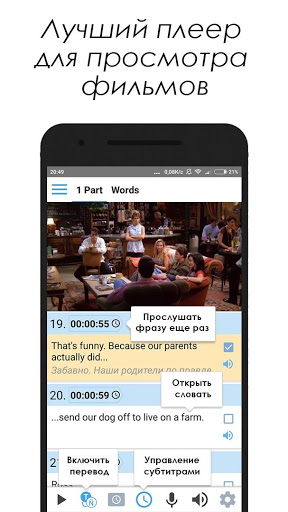 Специальный аудио плеер для аудирования. Можно легко слушать диалоги, видео, фильмы или сериалы.