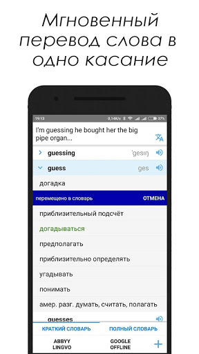 Слово открывается в одно нажатие. Несколько офлайн словарей и словари abbyy lingvo Dictionaries, Google переводчик.
