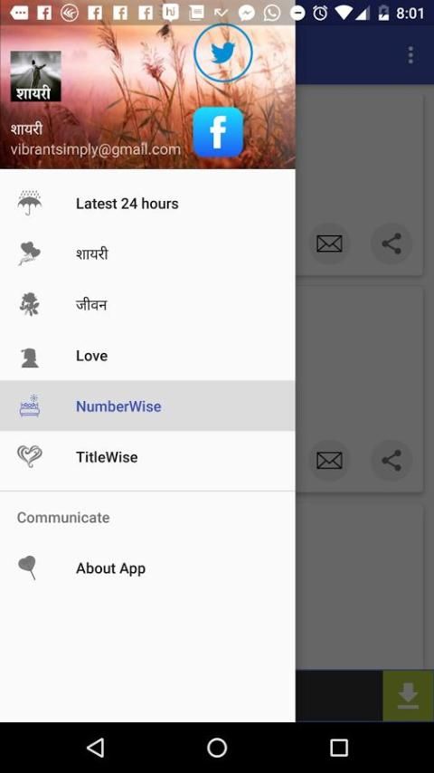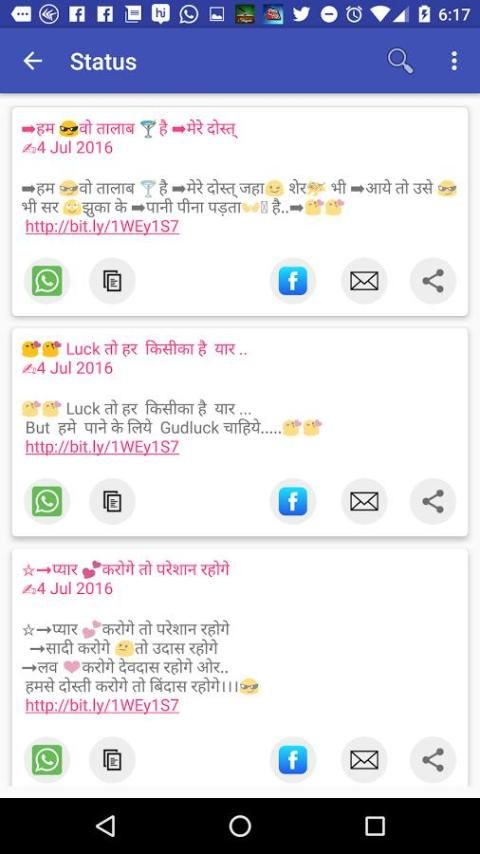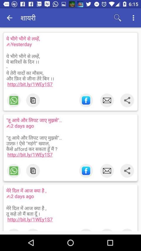 Окончательный New & СВОБОДНЫЙ коллекция Sher O Shayari по различным категориям. В соответствии с этим приложением вы можете найти хорошо категоризированный коллекцию Shayari SMS и сообщений, которые вы можете поделиться с друзьями