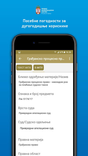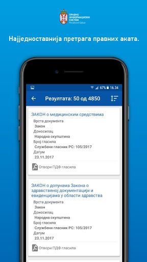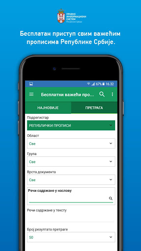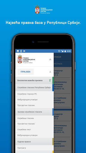 Aplikacija omogućava objedinjenu pretragu svih sadržaja u Pravno-informacionom sistemu RS. Pretplatnici na elektronske baze mogu koristiti svoje korisničko ime i lozinku i u okviru Android aplikacije i na taj način, u obimu svoje pretplate, pristupiti aktima sadržanim u pojedinačnim bazama, i to:
