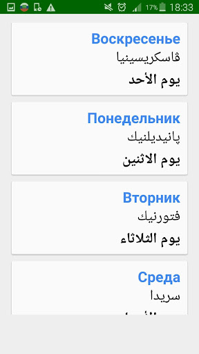 Наиболее важными словами на русском языке переведены на арабский язык с помощью произношения.
