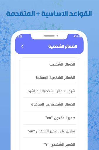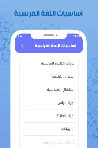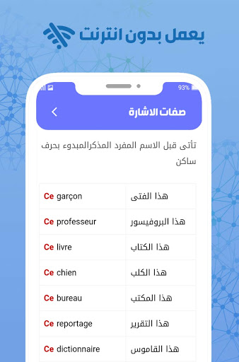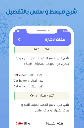 Semua pelajaran diterjemahkan dari bahasa Perancis ke bahasa Arab dan dijelaskan secara terperinci dan disokong oleh contoh dan ujian, kemudian kata ganti, kata kerja dan ayat dalam mempelajari tatabahasa Perancis.