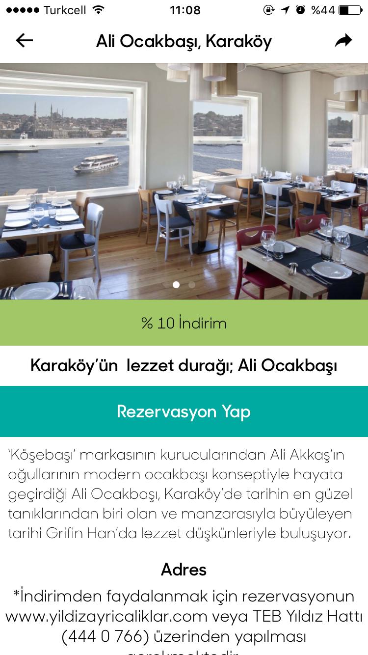 TEB Yıldız uygulaması ile size özel bir çok kategorideki ayrıcalıklı tekliflerden faydalanabilirsiniz. Seçkin mekânlardaki bu tekliflerden faydalanmak için TEB Yıldız müşterisi olmanız yeterli. Uygulama içerisinde yer alan, size özel teklifler bölümünden dilediğiniz kampanyayı inceleyerek rezervasyon yaptırabilirsiniz.