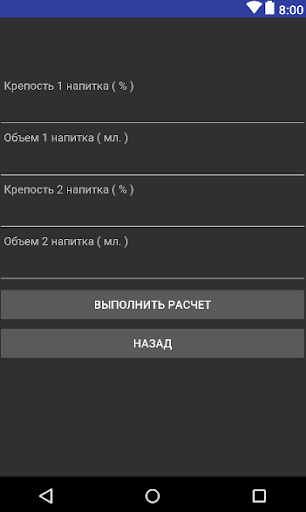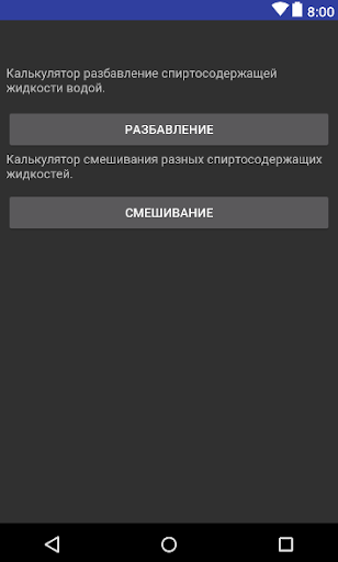 Определяет необходимое количество воды для разбавления спирта содержащих жидкостей, а также посчитает процент содержания спирта в различных по крепости напитках.