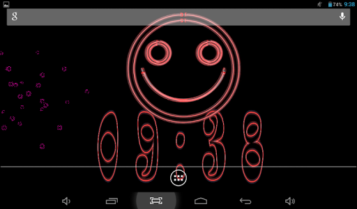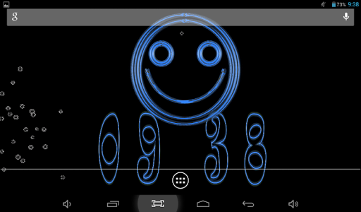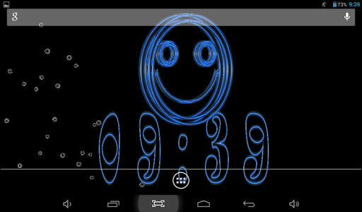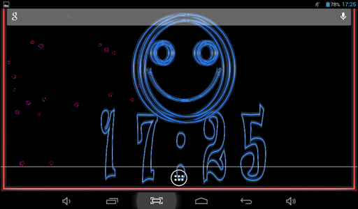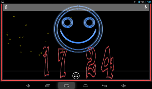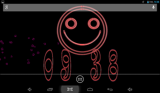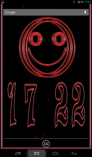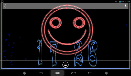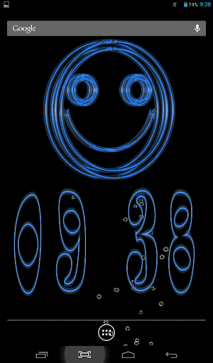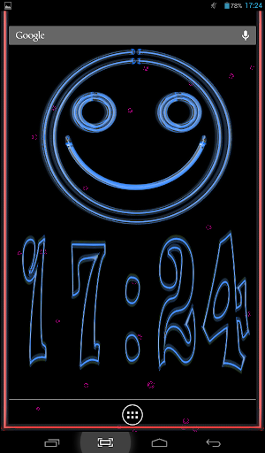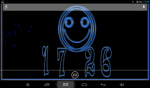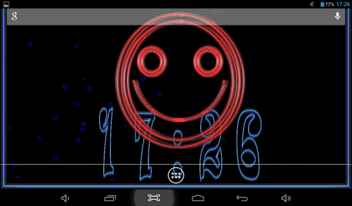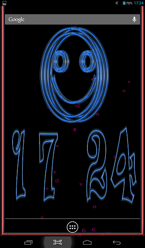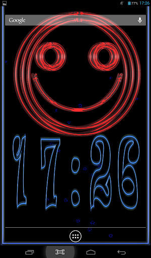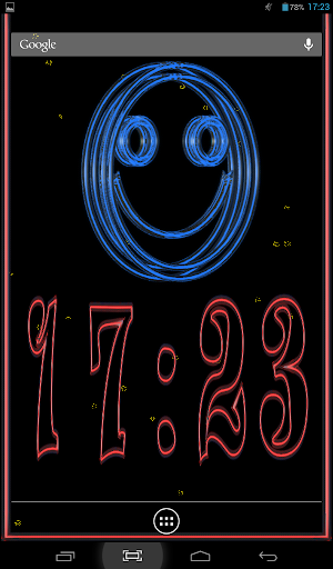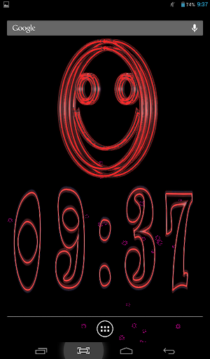Вращающийся неоновый смайл и цифровые часы. Две цветовые схемы для смайла, рамки и часов, возможность выбора цвета частиц, их размера, размера смайла, несколько типов поведения частиц. Оригинально и позитивно.