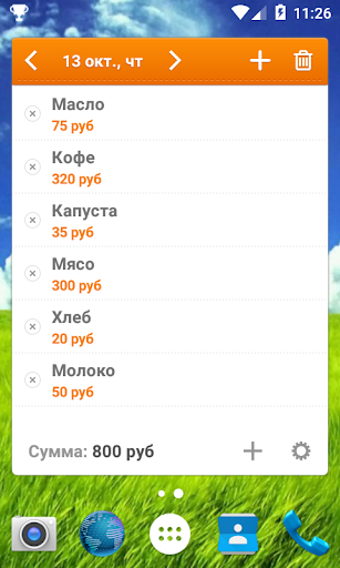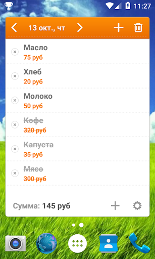 Список покупок - удобное приложение при походе в магазин. Виджет поможет Вам ничего не забыть купить, легко подсчитать сумму покупок, создавать удобные списки покупок. Купили продукт из списка? Одним нажатием вычеркните его, а виджет автоматически обновит сумму оставшихся продуктов в списке. Все гениальное - просто!