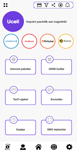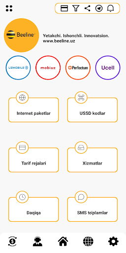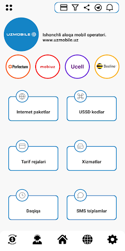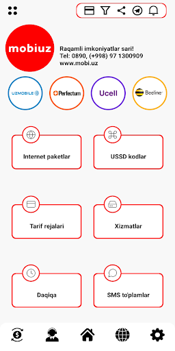 Dasturni o'rnatganingizdan so'ng O'zbekiston mobil aloqa operatorlari UMS Uzmobile Ucell Beeline va Perfectum haqida barcha savollaringizga javoblar olasiz va quyidagi imkoniyatlarga ega bo'lasiz:
