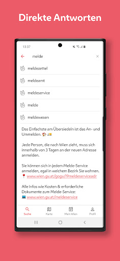 Приложение города Вена предоставляет правильную информацию в нужное время для всех, кто живет в Вене: прямые ответы, карта города, коммуникации в реальном времени и персонализированная информация из города.