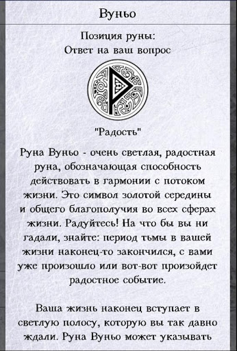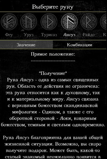Каждая руна интерпретируется как индивидуально, так и в комбинациях. Все описания составлены профессионально и подробно раскрывают все детали, очень точно предсказывают будущее и дают советы какой путь лучше выбрать.