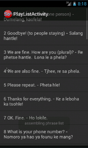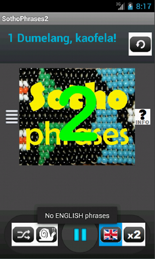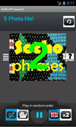 SothoPhrases2 is a simple yet useful and completely free Android app that plays about 35 frequently used Sotho (seSotho) conversational phrases with their English translations on your Android phone. This is a sequel to SothoPhrases1. If you master these phrases, you should be able to delight and “click” with Sotho speakers. The app cycles (random/sequentially) through the various phrases, and you can lengthen the pauses inbetween sentences in case you want to practice them out loud or need more time. You can switch off the English translations so that you can just listen to the Sotho phrases playing back, if you are commuting or waiting to see the bank manager! Also has options for repeat/single play; long/short pauses and random/sequential play.