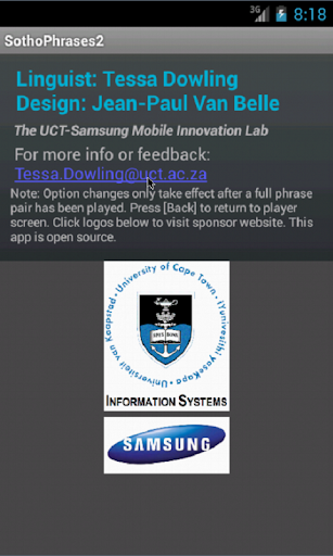 This app was built in the interest of getting South Africans to talk to each other but can be used by anyone interested in learning some basic Sotho phrases. Compact. Easy-to-use. Supplements the phrases from the popular SothoPhrases1. This app was developed by the University of Cape Town’s Samsung Mobile Innovation Lab as a collaboration between Tessa Dowling, African Languages and Jean-Paul Van Belle from the Information Systems Department. Also available in four other South African languages. Find all our apps on: https://play.google.com/store/apps/developer?id=Information Systems Dept - University of Cape Town