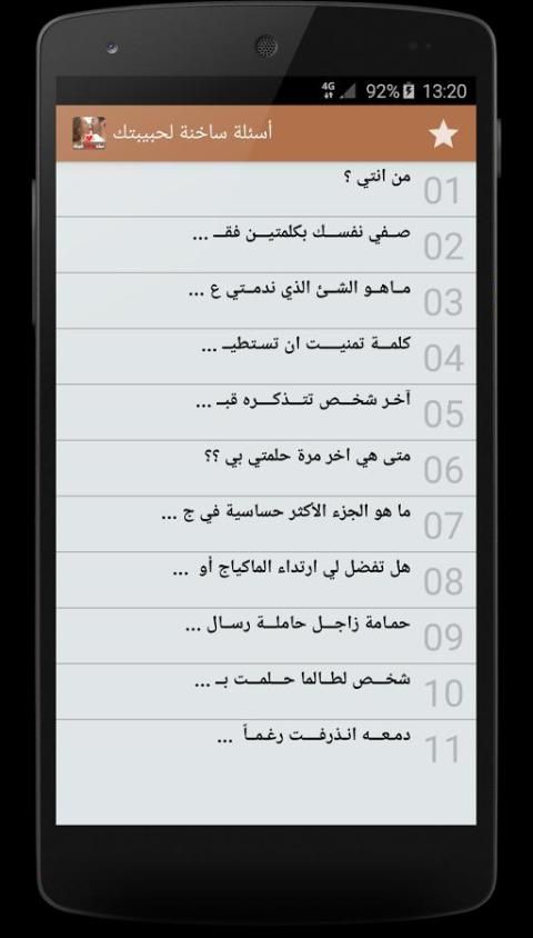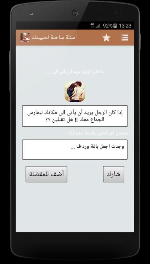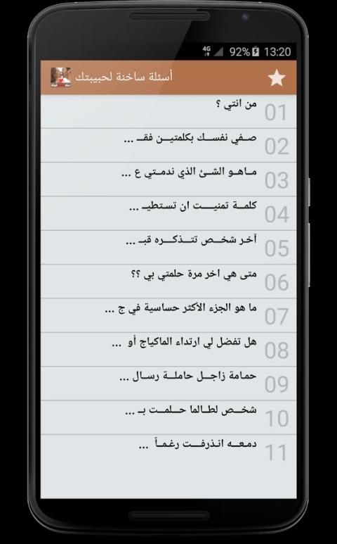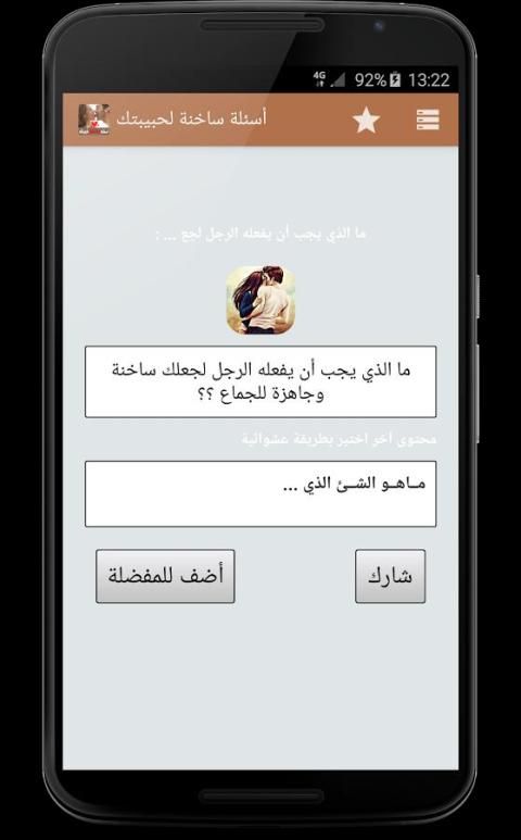 يقدم لكم البرنامج مجموعه كبيرة الأسئلة الساخنة – للكبار فقط تشمل أجمل و أروع الأسئلة الغرامية التي يمكن أن ترسلها لمن تحب, يمكن ارسالها عبر وسائل التواصل الاجتماعي مثل واتساب أو فيسبوك, ثم تصميم التطبيق خاصة للعالم العربي بشكل بسيط ومفهوم للجميع مع مراعات تيسير الوصول لأغلب الخدمات.
