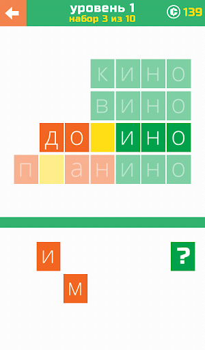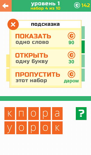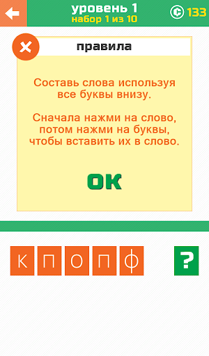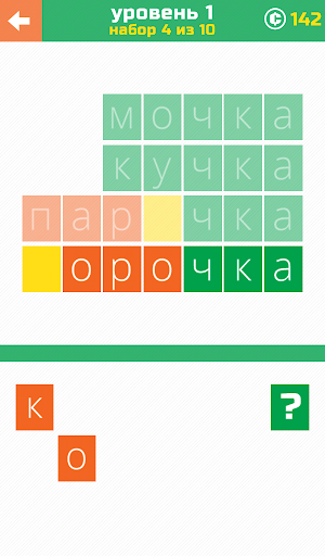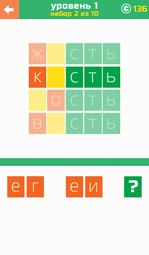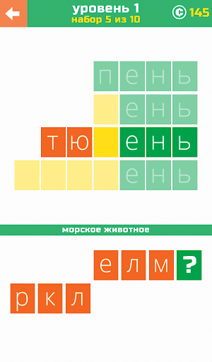 В каждом наборе вам надо расставить буквы так, чтобы получились три или четыре слова, заканчивающихся на одни и те же 3 буквы. Иногда встречаются подсказки, как в кроссвордах.