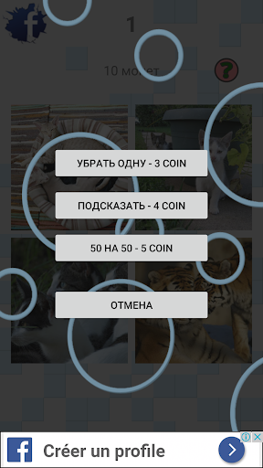И наконец 50 на 50. Уберет две лишние картинки с экрана, нужно подметить что картинки не исчезнут, а отделятся от остальных и пропадет возможность их выбрать. При использовании 50 на 50 пропадает возможность выбора «убрать одну». Стоит 5 монет.