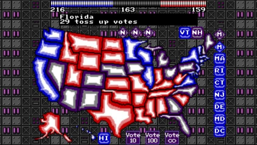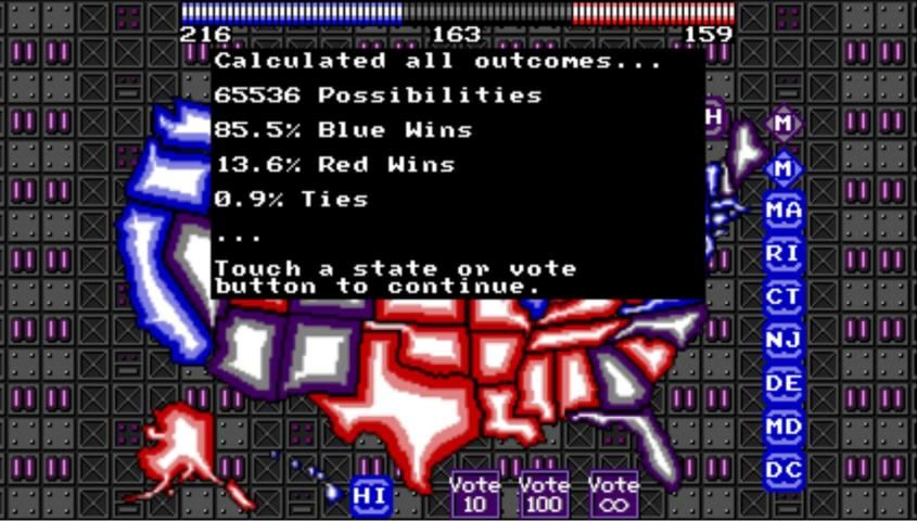 Нажмите состояния на карте, чтобы установить их в красный, синий, или подкинуть. Затем нажмите кнопку голосов, чтобы увидеть результаты. Первые кнопки голосования отображать 10 или 100 результатов для текущего состояния карты. Кнопка Окончательное голосование вычисляет все возможные результаты для текущего состояния карты.