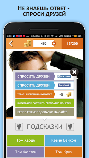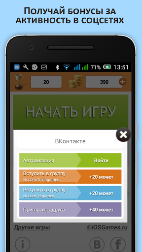 Играть можно как в одиночку, так и в онлайн с живыми соперниками. В первом случае, вы можете играть без интернета, никуда не торопясь. А если затрудняетесь с ответом можно попросить помощи у друзей в социальных сетях ВКонтакте или Facebook.
