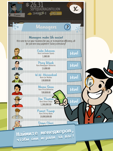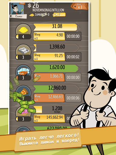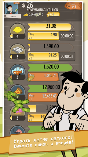 Вы пройдете путь от скромного старта за одинокой стойкой с лимонадом до должности генерального директора преуспевающего мультинационального конгломерата, печатающего деньги. В этом кликере-симуляторе вы испытаете приключение всей жизни.