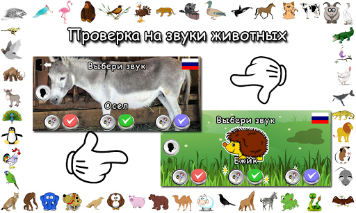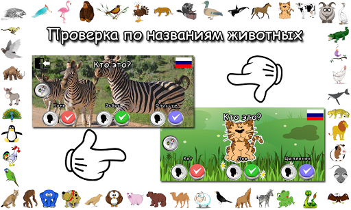 3) Проверка на звуки животных. Здесь вам также придется проверить свои знания: вы увидите животное, услышите, как оно называется, и вам нужно указать звук этого животного.