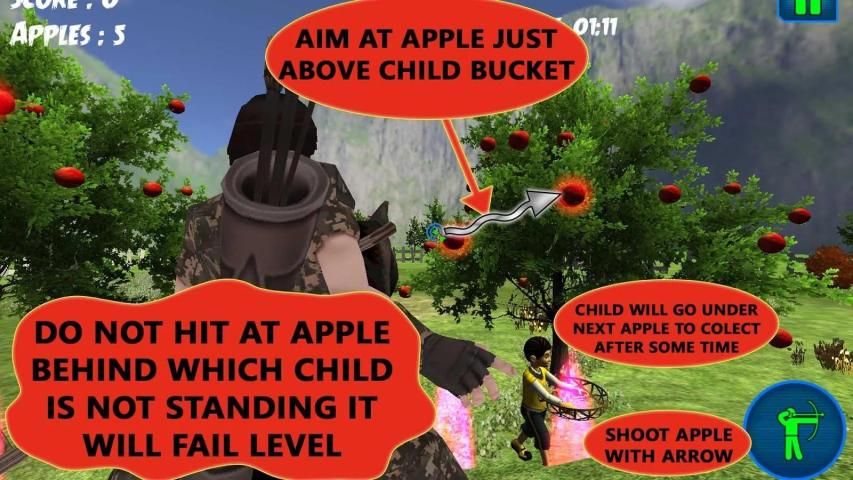 Play Real Archer Apple Shooter in 3D for archery lovers. Drag your screen to aim the apple under which the child is exclusively waiting for the apple to come down in his basket and your bow will be ready to cut the apple in pieces. When you have cut one apple to pieces and it has delivered to boy in the basket the boy will move to the next animating ripe apple and stand there waiting for you to deliver another apple to him in this archery game. You have unlimited arrows while sitting on the horse, to shoot the apples but time is limited for you to shoot the apples and fill the basket. Being a good archer, make you aim to hit the right apple, don't waste the time and complete maximum apples in this archery game. Small boy is waiting for you to download the best game in archery and aiming and fill his basket, download it now! ***** FEATURES 3D environment Real 3D environment is waiting for you in the game with nicely colored theme background. Campaign through each level to experience it and put yourself into fun mode. Animation Excellent and realistic animation effects of child and the archer also. Horse, arrows and bow Unlimited arrows within a limited time to hit specifically targeted apple, avoid wasting time while hitting other apples. Multiple targets of apples to shoot for you on the trees with Bow and Arrows. Playing controls Touch on the screen and enjoy easy and user friendly control to play the archery game. Missions Unlock various level after completing each previous one. ***** INSTRUCTIONS Touch the screen and aim then click the shoot button to release draged arrow from bow. TARGET Your target is to fill the basket of the baby with fresh apples with thee accurate shots in this archery game enjoy and have fun