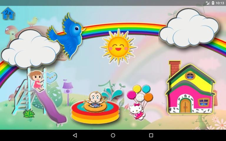 # 1: Интерактивная сцена: Учиться и играть с различными красочными объектами (качели, котенок, воздушные шары, дождь, детский бассейн, птиц).