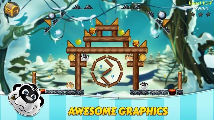 Помогите животным катиться к их еде. Обезьяны едят бананы, яблоки, и груши, и медведи едят лосося и мед. Деревянные блоки хрупким в то время как каменные блоки не являются. Есть несколько элементов игры, чтобы прийти с инструкциями в игре по ходу игры.