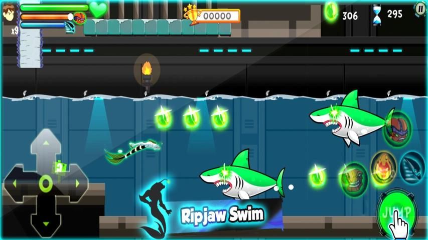 swimming : press Jump and left or right direction to swim with Ripjaws higher, release finger from button to go down!