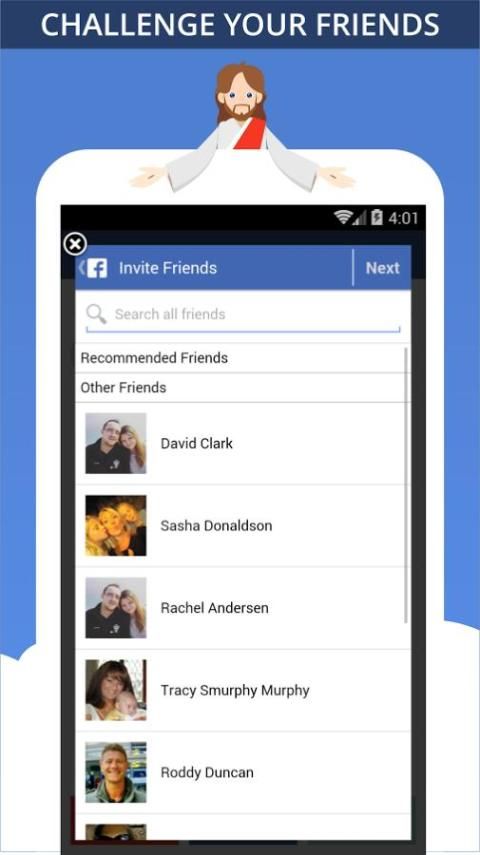 Единственная игра Библии Пустяки на Play Store, который показывает режим Vs друга. Просто найти друга с нашими установлена Библия Викторина, или пригласить их установить. Выберите количество библейских вопросов, а затем бросить вызов своему другу. Вы закончите викторину, то это ваши друзья превращаются. После того, как оба Библии игра пустяков игроки выполнили вопросы Вы тогда будете уведомлены и кто победитель был! Фантастический способ общения с друзьями & семьей и узнать о Библии и христианства вместе.
