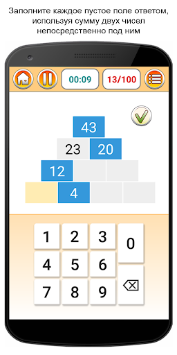 Пирамида – занимательная игра на время, состоит из блоков в виде пирамиды. Некоторые блоки заполнены числами. В каждый пустой блок нужно ввести сумму двух чисел, которые находятся непосредственно под этим блоком.