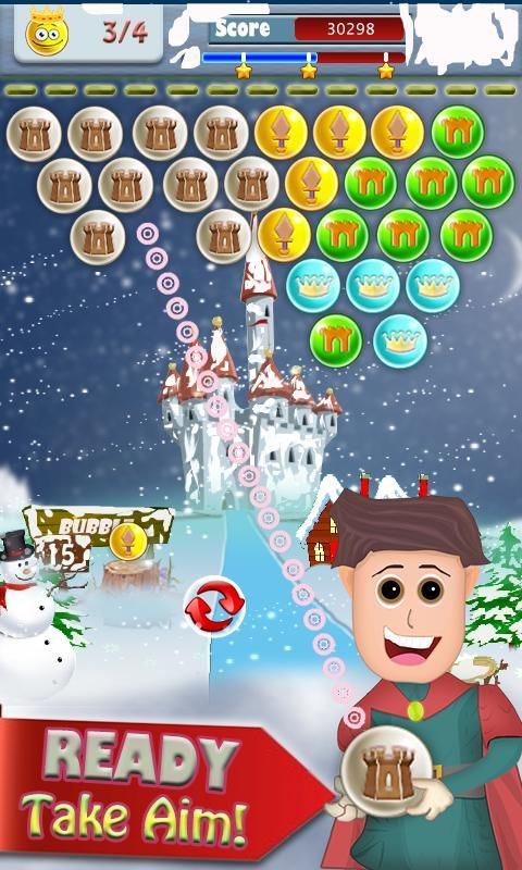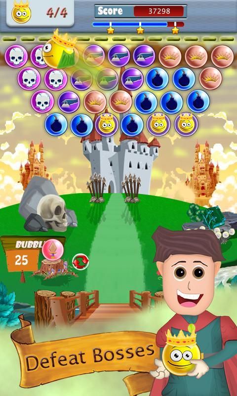 Победить различные уровни с различными целями в пузырьковой королевстве платформы к прогрессу.