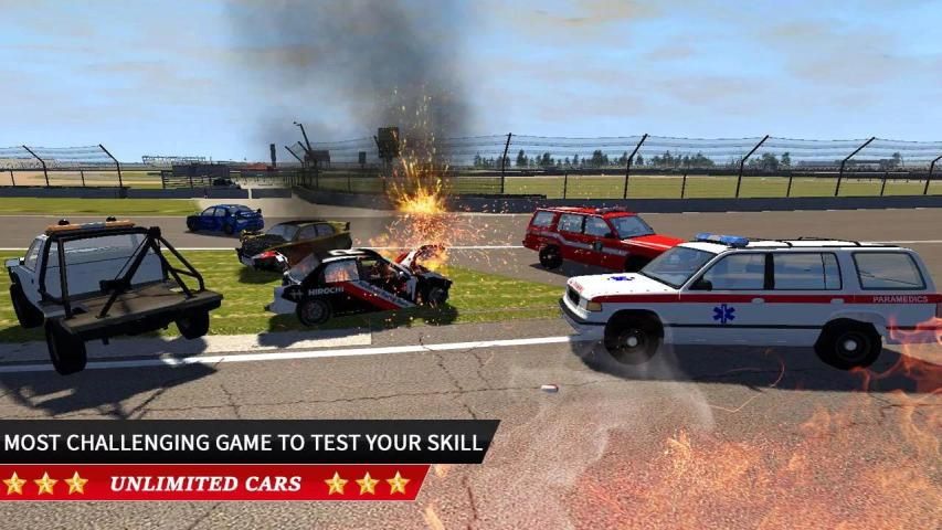 Это бесконечная игра с грохотом уровня с различными реалистичными режимами. Там есть платформа трюков, где ваш автомобиль может выполнять трюковые трюки. Окружающая среда этой игры REAL обломков автомобилей также является непрерывной на арене автокатастрофы. Там, где есть тонны других нерушимых моторных машин.