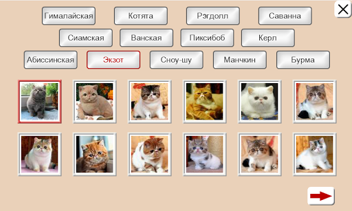 В игре “Пазлы” представлены 13 тем: «Гималайская», «Котята», «Рэгдолл», «Саванна», «Сиамская кошка», «Ванская», «Пиксибоб», «Керл», «Абиссинская», «Экзот», «Сноу-шу», «Манчкин», «Бурма».