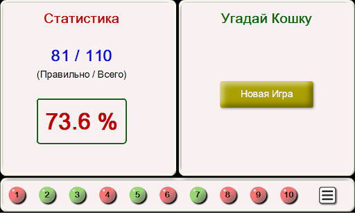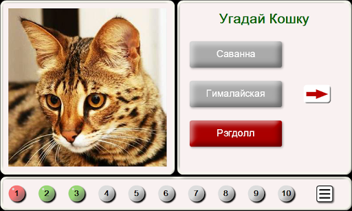 Игра “Угадай Породу Кошек” является забавной викториной. Из 3 предложенных вариантов вам нужно выбрать породу кошки, которая указана на фотографии. Правильные ответы обозначаются зеленым цветом, а неправильные – красным, За каждый правильный ответ получите 1 балл. После того как вы угадаете 10 фотографий, вы сможете посмотреть статистику –количество правильных ответов и количество всех фотографий, а также процент правильных ответов от общего количество фотографий кошек.