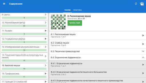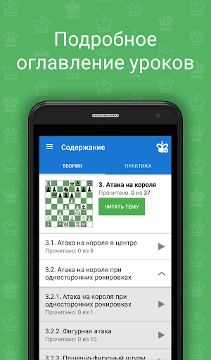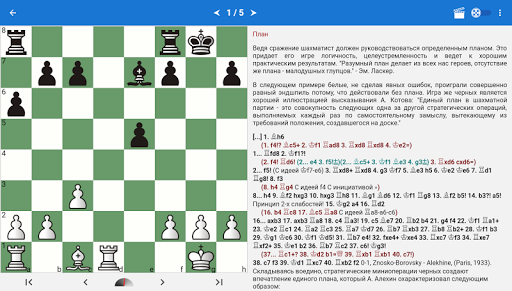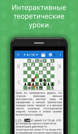 Также в программе содержится теоретический раздел, в котором поясняются методы игры в определенной стадии партии на реальных примерах. Теоретические уроки интерактивны, то есть вы можете не только читать текст уроков, но и делать ходы на доске и самостоятельно разбирать непонятные моменты.