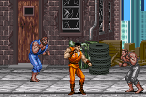 Your character moves with the control pad, and can either attack with melee punches/kicks, or jump. Jumping combined with the attack button (while mid-air) causes for a jump attack. Pressing both buttons at the same time performs the character's special move. A character's special move eats up a small portion of the life bar, but instantly knocks down all surrounding opponents. Useful for getting out of sticky situations. Grapple attacks require you to move in close, but once an opponent is grabbed, you can then slam them to the ground knocking down other enemies.