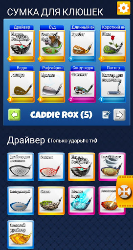 • Выберайте между различными клюшками, такими как вуд, драйвер, длинный айрон, короткий айрон, средний айрон, ведж и сэнд-ведж