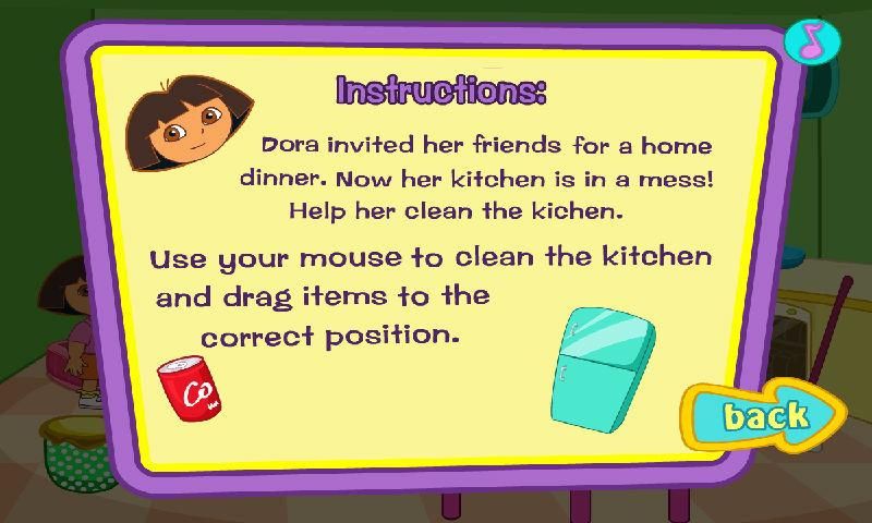 Help Dora to clean her Kitchen and decorate it for the Party. Your job is to put each object in its proper place to make the Kitchen look perfectly. Pay attention to the time! Dora Room Clean is a very fun game!