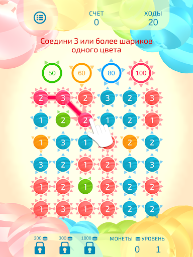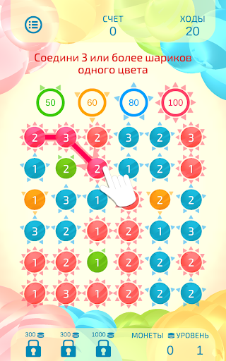 Шарики можно соединять в любом направлении: по вертикали, горизонтали или диагонали.