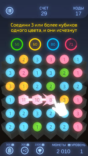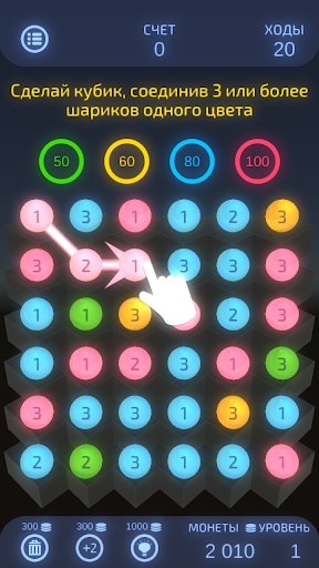 При игре в трудном режиме в месте, откуда игрок убирает свой палец, появляются кубики c цифрами, показывающими общее количество очков за соединенные шарики. При соединении 3 или более кубиков одного цвета игрок получает очки, а кубики исчезают.