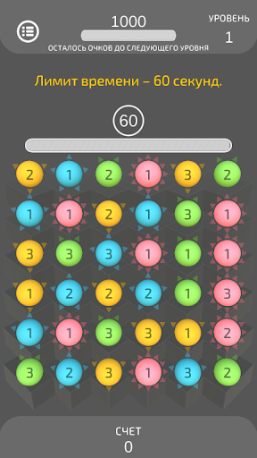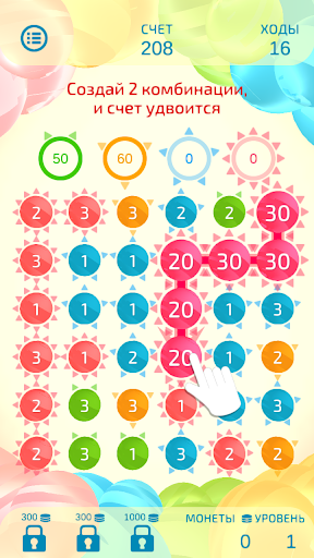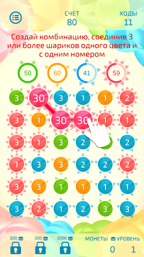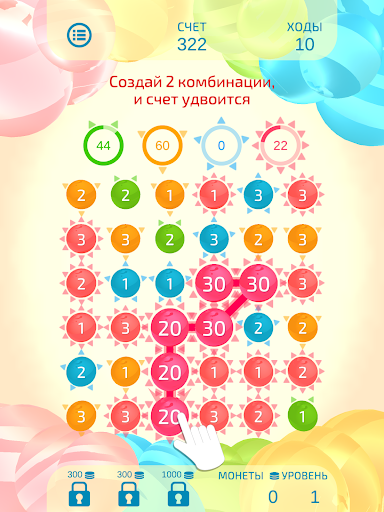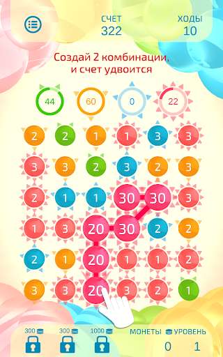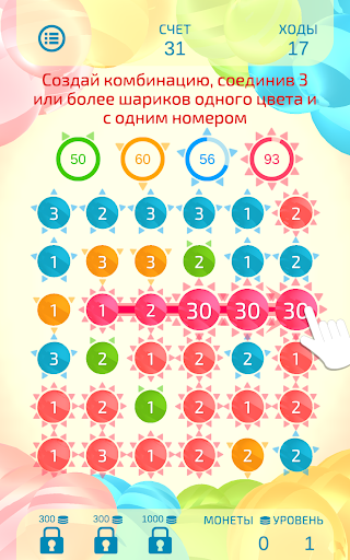 При соединении 3 или более шариков одного цвета и с одним номером очки на шариках умножаются на 10. Счет может увеличить, соединив несколько комбинаций. В этом случае очки за комбинацию умножаются на количество созданных на этот момент комбинаций.